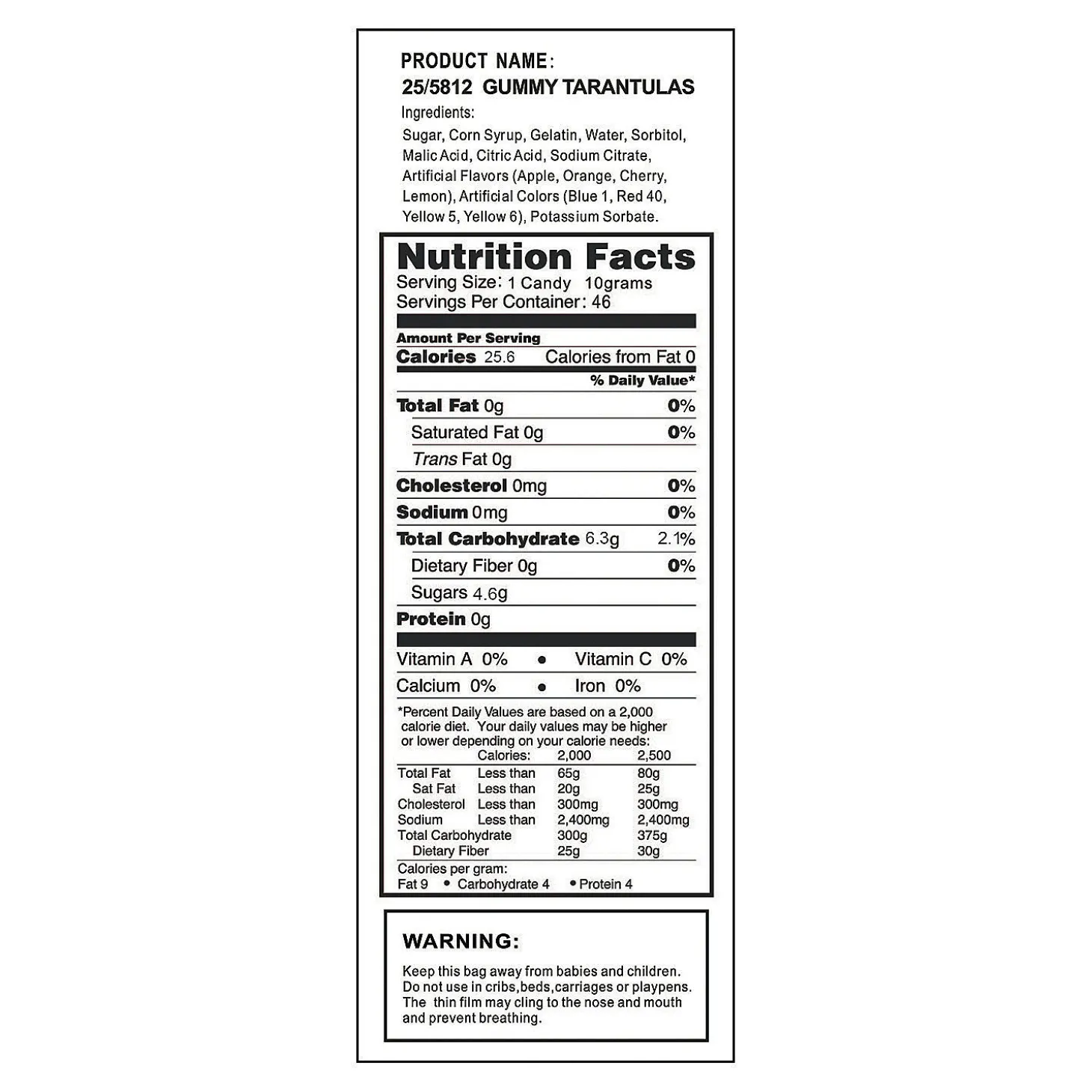 • Spooktacular Candy Buffet: Create A Spine-Chilling Candy Buffet With Our Vast Selection Of Sweets, Offering A Variety Of Flavors, Colors, And Textures That Will Leave Your Guests In Awe.• Bewitching Cake Toppers: Decorate Your Halloween-Themed Cakes And Cupcakes With Our Candy Selections, Transforming Them Into Edible Masterpieces That Will Impress Both Young And Old Alike.• Creative Candy Crafting: Let Your Creativity Run Wild By Using Our Candies As Unique Craft Supplies, Creating Edible Jewelry, Colorful Mosaics, Or Whimsical Scenes That Will Amaze Your Guests.Product Description:Gummy Tarantulas. Eek! Spiders! These Creepy Tarantula-Shaped Candies Make A Sweet Treat For Halloween Night. Individually Wrapped. Fat-Free. • Candy Is Non-Returnable. For More Information, Visit Our “Return Policy” Page Located On Our Website.• Ingredient, Nutrition, Allergen And Other Product Information Are Provided On Our Web And Mobile Sites For Reference Purpose Only, Without Warranty Or Representation As To Accuracy. Manufacturers Adjust Their Labeling Regularly And Are Solely Responsible For The Accuracy Of The Information. For General Questions Concerning These Items, Please Contact Our Customer Service At 800-228-0475.Size: Total Wt., 1 Lb.Quantity: 46Cherry, Apple, Lemon And Orange Flavors.