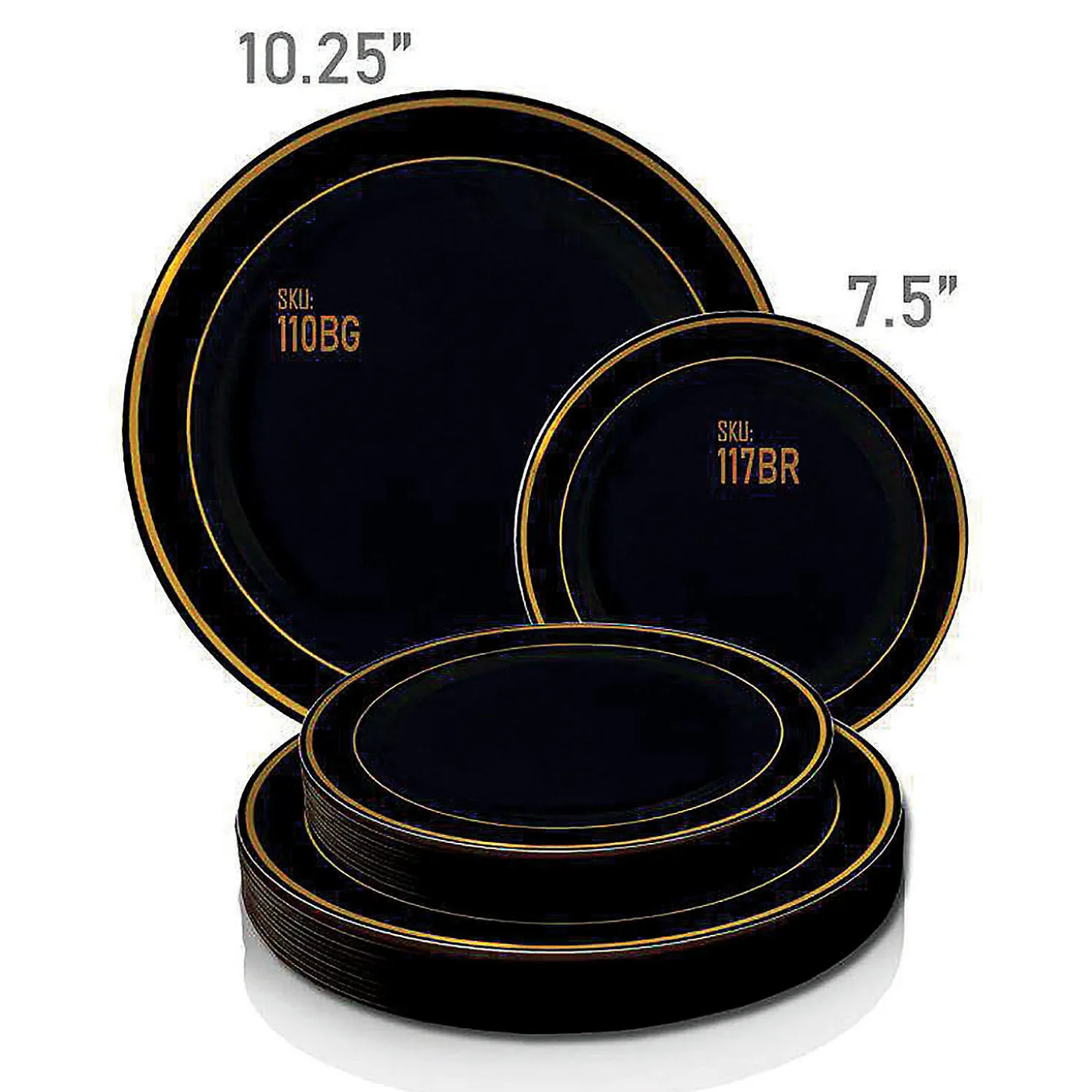 • Approx. Inner Diameter: 7 ½”• Approx. Outer Diameter: 10 ¼”• Approx. Outer Rim Diameter: 1 ¼”• Quantity: 5 Packs Of 10 Plates• Color: Black With Gold Rim• Shape: Round• Material: Plastic• Disposable: One-Time, Single Party Use• Recycling Code: #6 Ps Polystyrene• Bpa-Free: Yes Special Shipping Information: This Item Ships Separately From Other Items In Your Order. This Item Cannot Ship To A P.O. Box. This Item May Be Subject To Additional Processing Days. Item Is Not Eligible For Expedited Shipping. You May Initiate A Return For Unused Items Within 30 Days, If The Items Are In Original Packaging With All Original Materials Included With The Shipment.