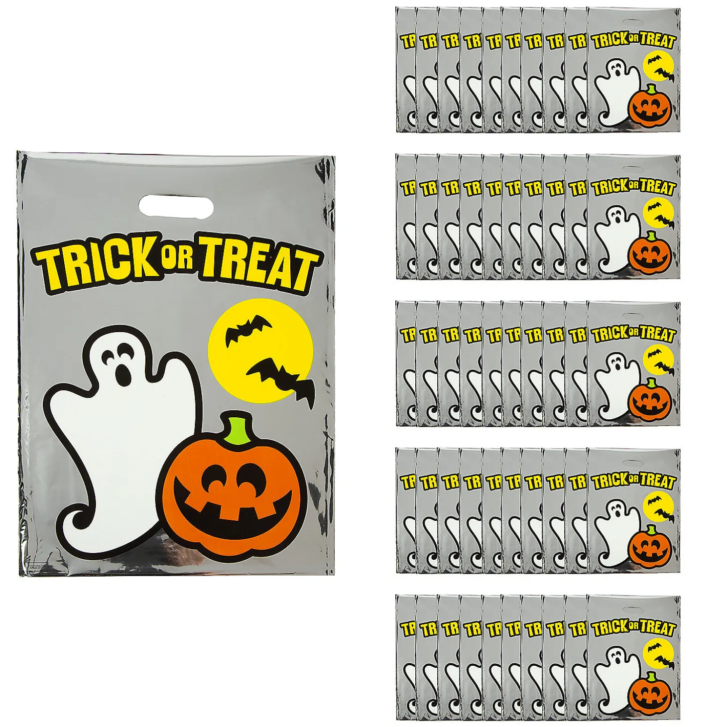 • Safe Trick-Or-Treating: These Reflective Bags Help Trick-Or-Treaters Be Seen As They Roam The Neighborhood In Pursuit Of Halloween Candy. Share Them With Ghouls And Goblins Of All Ages For Extra Peace Of Mind On Halloween Night.• Durable Quality: These Shiny, Sturdy Bags Are Strong Enough To Hold A Substantial Halloween Haul. • Lightweight: Letting Your Trick-Or-Treat Bag Weigh You Down Is For Amateurs! This Bag Is Lightweight Enough For Even The Smallest Halloween Friends—The Better To Carry More Candy!Product Description:Fabulous In Foil! These Reflective Halloween Trick-Or-Treat Bags Are Perfect For Party Favors, Or Hand Them Out To All The Ghouls And Boos As They Explore The Neighborhood Safely In Search Of Sugar-Filled Treats. Electric Light Glints Off The Mirror-Like Sheen Of Their Goody Bags To Ensure High Visibility. Plastic. (50 Pcs. Per Unit) 12 1/2″ X 17″ © Otcsize: 12 1/2″ X 17″Quantity: 50Material: Plastic