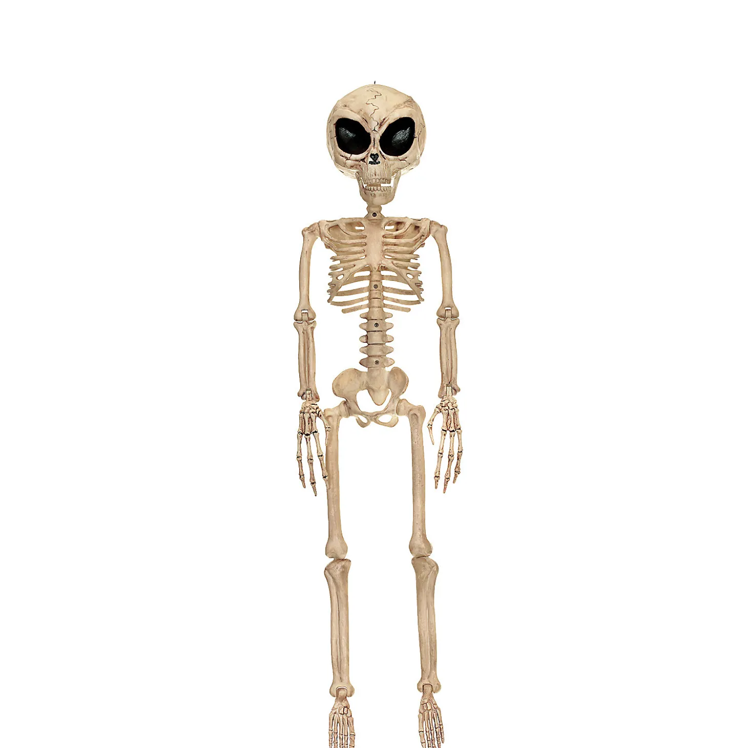 Alien Skeleton. This Frighteningly Realistic-Looking Alien Skeleton Looks Like It Could Have Been Found In The Desert Near Area 51. This Alien Skull Features Large Almond-Shaped Eyes With Small Jaw. Detailed Bones Measures 37″ Tall Made Of Durable Plastic Limbs Are Posable.
