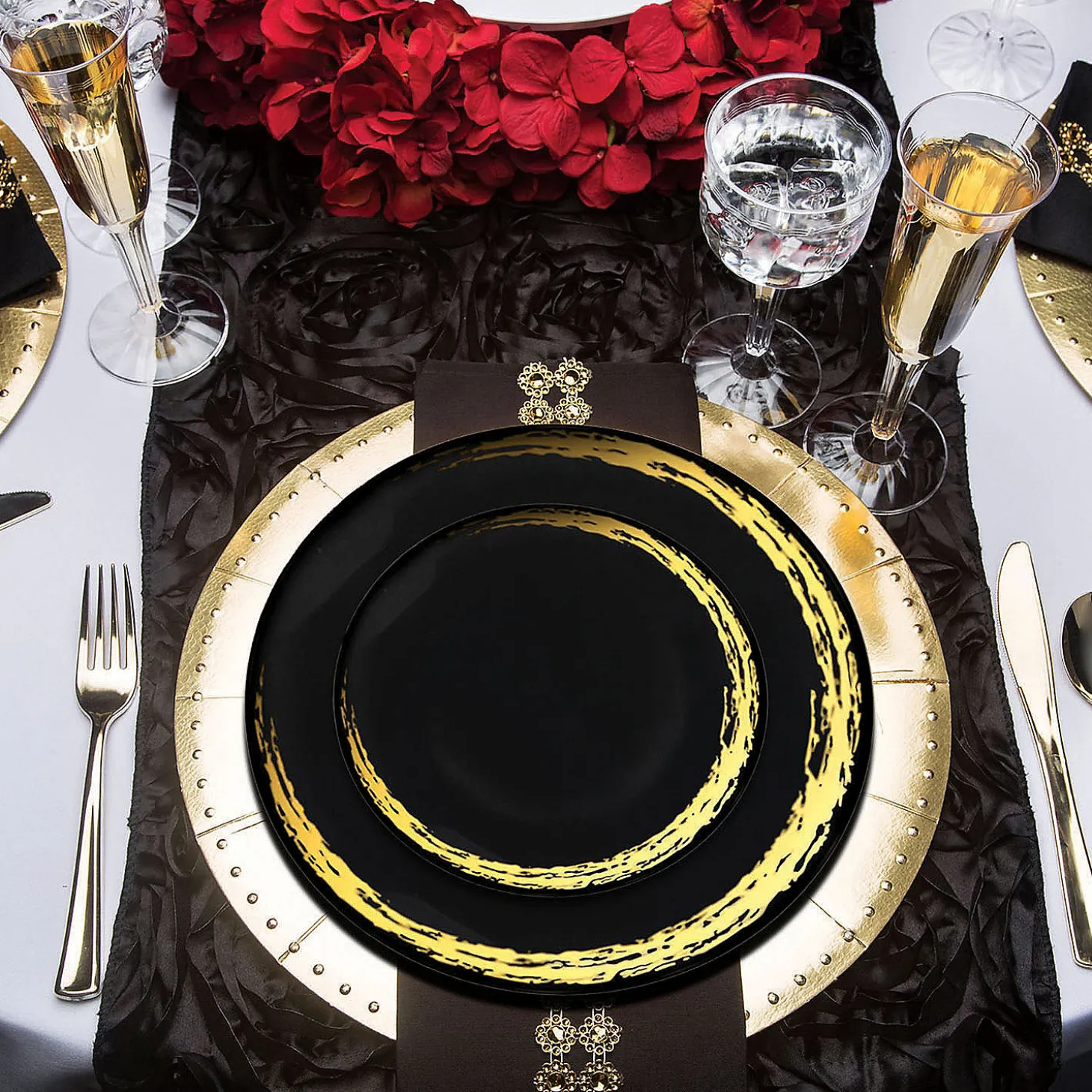 Be the first to review “Black With Gold Moonlight Round Disposable Plastic Dinnerware Value Set (20 Settings)” Cancel reply
