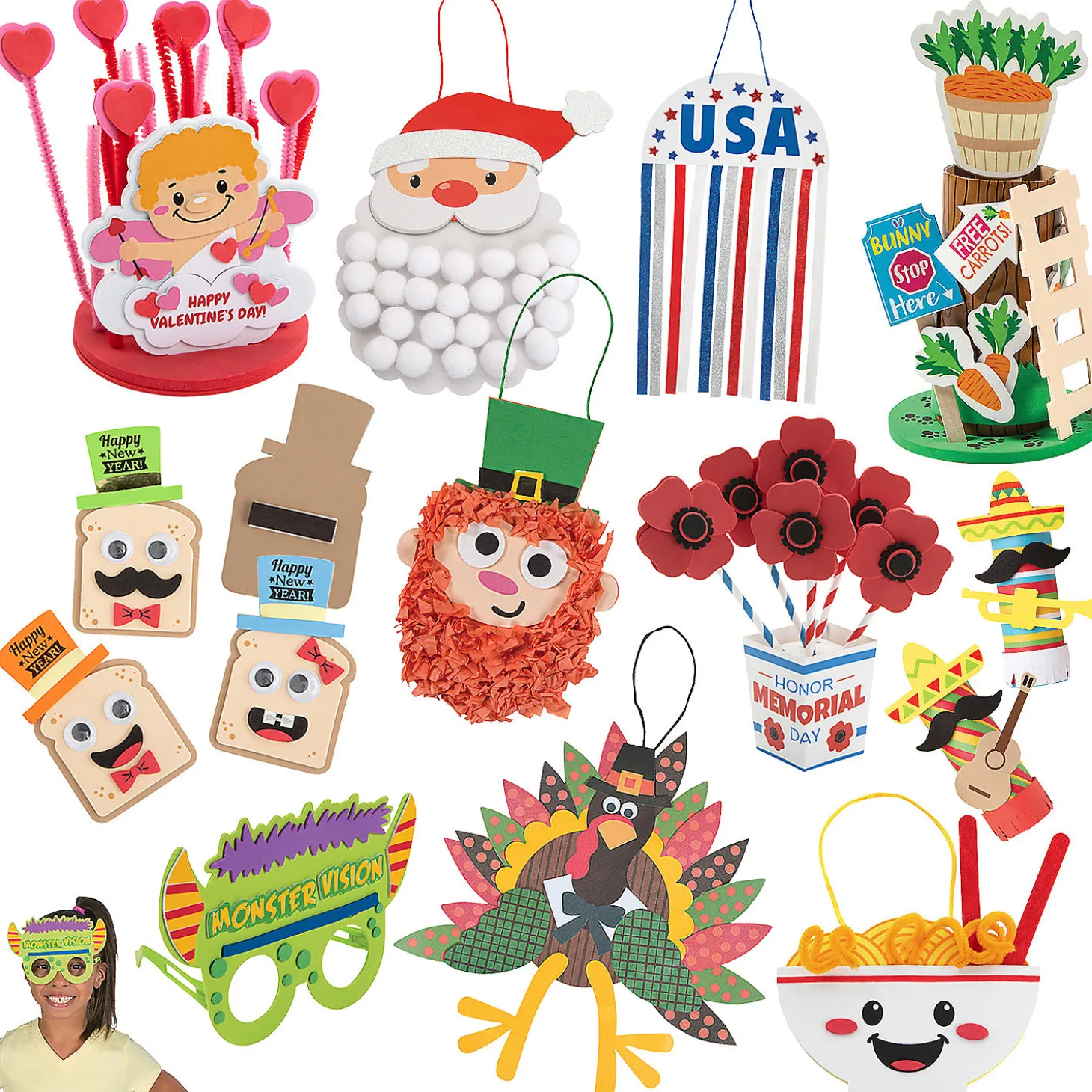 Grab This Craft Kit And Have The Perfect Selection Of Crafts For Many Different Holidays. This Convenient Kit Combines Craft Kits For Holidays Throughout The Year And Is A Great Addition To Classroom Supplies For Daycare, Homeschool Programs Or Sunday School Classes. (132 Pcs. Per Unit) Makes 132. All Craft Kit Pieces Are Pre-Packaged For Individual Use. Kits Include Instructions.Includes:• 12 Easter Bunny Trap Craft Kits (Includes Self-Adhesive Foam Pieces, Paper Craft Tubes And Wooden Craft Sticks. 3 1/4″ X 7″)• 12 Lunar New Year Noodle Bowl Craft Kits (Ncludes Self-Adhesive Foam Pieces, Wooden Craft Sticks, Chenille Stems And Satin Cording. 5″ X 5 3/4″)• 12 Cardboard Mariachi Craft Roll Craft Kits (Includes Self-Adhesive Foam Pieces And Paper Strips. 5 1/4″ )• 12 Foam Cupid In Heart Garden Craft Kits (5 1/2″ X 5″ Includes Self-Adhesive Foam Pieces And Chenille Stems.)• 12 Crinkle Tissue Paper Leprechaun Sign Craft Kits (Includes Self-Adhesive Foam Pieces And Satin Cord. 8″)• 12 Cardstock Memorial Day Straw Poppy Flower Bouquet Craft Kits (7 1/4″ X 9 1/4″ Includes Self-Adhesive Foam Pieces And Paper Straws.)• 12 Plastic Monster Vision Glasses Craft Kits (7″ X 5″ With 4 1/2″ Ear Pieces. Includes Self-Adhesive Foam Pieces.)• 12 Foam New Year’s Toast Magnet Craft Kits (2 3/4″ X 4 1/2″ Includes Self-Adhesive Foam Pieces, Plastic Googly Eyes And Foil Stickers. Magnets Are Packaged Separately. Do Not Discard.)• 12 Paper Turkey Craft Kits (11 1/2″)• 12 Statue Of Liberty Handprint Sign Craft Kits (Includes Self-Adhesive Foam Pieces, Cardstock And Satin Cording. 7″ X 10″)• 12 Countdown Santa Sign Pom-Pom Craft Kits (Includes Self-Adhesive Foam Pieces, Polyester Fiber Balls, Satin Cording And Cardstock Cutouts. 7 1/2″ X 8 1/2″)• Assortments Are Subject To Change At Any Time And May Vary From Picture Shown. Substituted Items Will Be Similar In Nature.