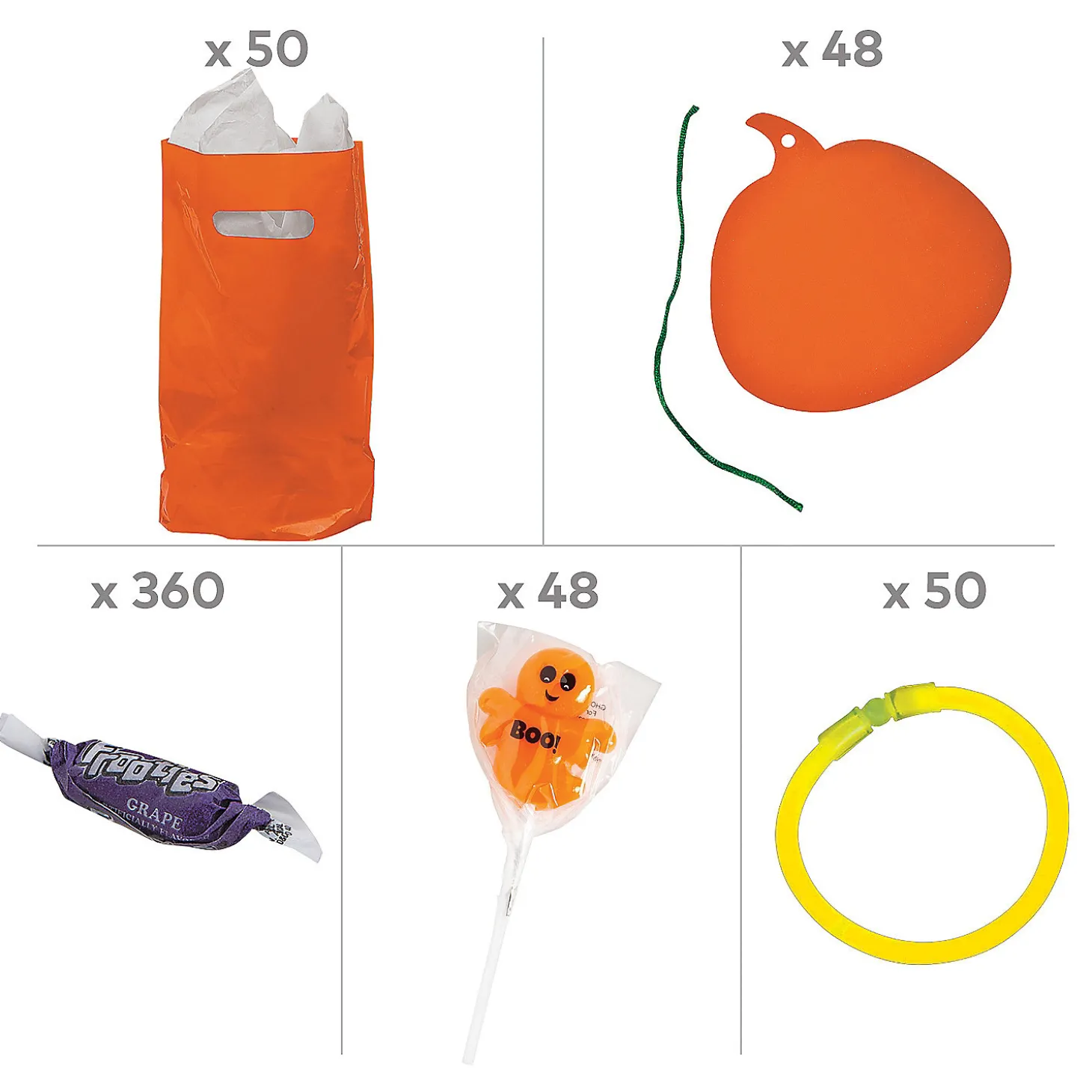 Pulling Together A Bunch Of Impressive Halloween Handouts For Kids Just Got A Lot Easier With The Help Of This Kit! Packed With Candy And Other Handouts For Halloween, This Kit Also Comes With Goody Bags To Stuff The Handouts In For Easy Distribution. This Kit Is A Fantastic Handout Solution For Kids At Harvest Festival Or Other Big Halloween Events. (556 Pcs. Per Unit) Assortment May Vary. Simple Assembly Required. Candy Is Non-Returnable. For More Information, Visit Our “Return Policy” Page Located On Our Website.Includes:• 48 Ghost Lollipops (Tropical Fruit Flavor. Individually Wrapped. Each 2-1/4″ Lollipop Is On A 4″ Plastic Stick.) Total Wt., 28 Oz.• 50 Plastic Glow Bracelets (8″) Simple Assembly Required.• 360 Grape Mini Tootsie Roll