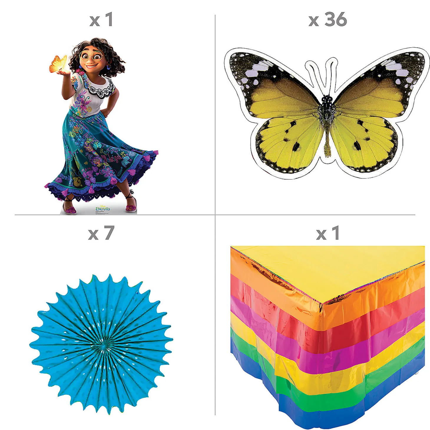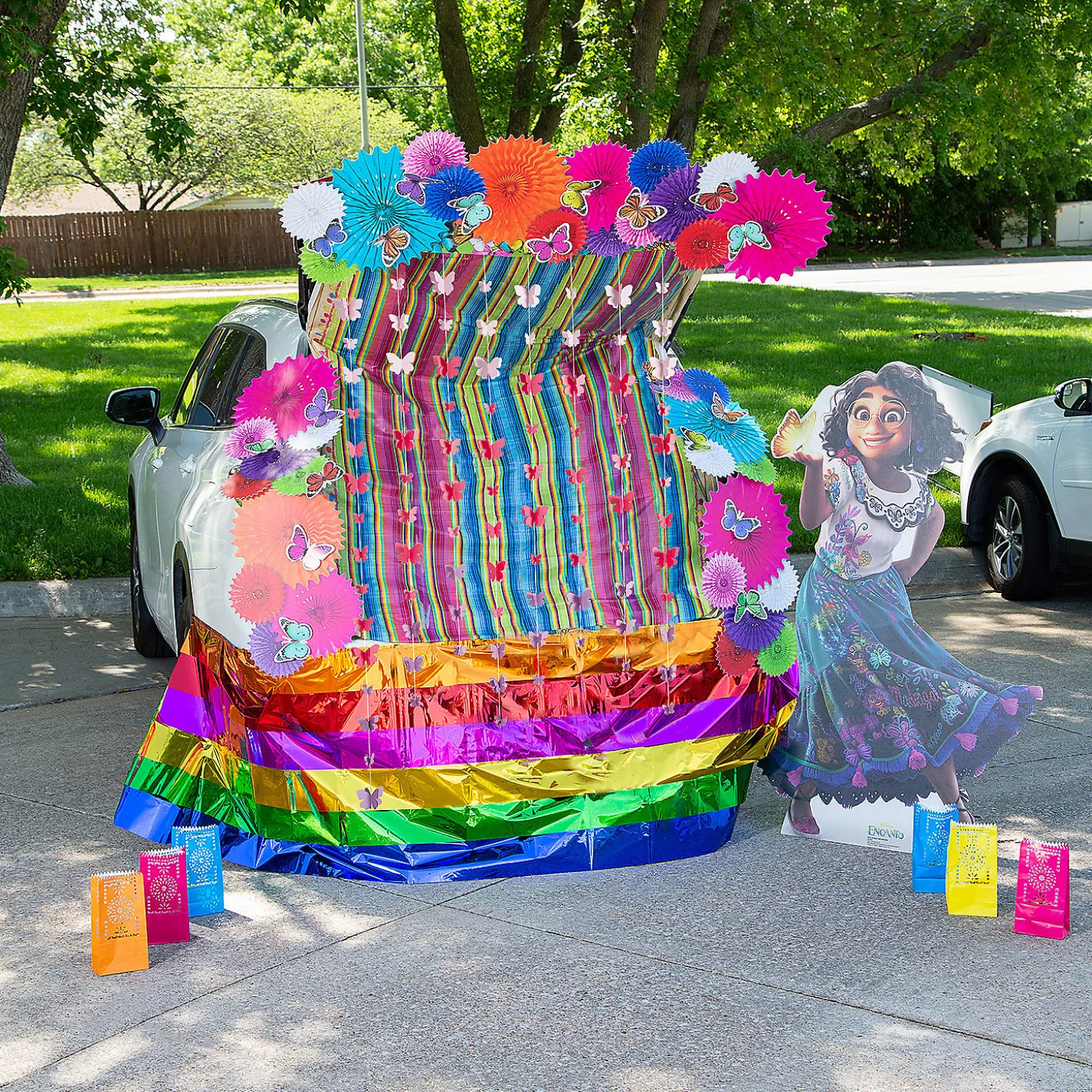 Trunk Or Treat, Give Them Something Fun To See! This Bright And Colorful Trunk Or Treat Kit Features The Beautiful Butterflies That Make Numerous Appearances In The Enchanted Encanto Movie, Symbolizing Transformation As Well As Acceptance. Perhaps More Importantly, They’Ll Help Your Trunk Or Treat Station Stand Out And Get Noticed! (71 Pcs. Per Unit)Includes:• 12 Foil Gold Metallic Balloon Weights (5 1/2″)• 1 Cardstock 3D Butterfly Ombre Curtain Backdrop (6 Ft. X 6 Ft.)• 1 Cardboard Disney’s Encanto Mirabel With Butterfly Stand-Up (39″ X 60″ Stand-Ups Are One-Sided With A Brown Cardboard Back. Simple Assembly Required.)• 12 Paper Fiesta Luminary Bags (Not Flame Retardant. Recommended For Use With Battery-Operated Tea Lights. 5″ X 10″)• 1 Plastic Fiesta Metallic Ruffle Table Skirt (Includes Elastic To Keep Skirt In Place. 9 Ft. X 29″)• 7 Cardstock Realistic Photo Colorful Paper Fan Cutouts (16″ – 22 1/4″ Fan Design Is Printed. Simple Assembly Required.)• 1 Plastic Serape Fiesta Tablecloth (Disposable. 54″ X 108″)• 36 Cardstock Schoolgirl Style™ Woodland Whimsy Butterfly Bulletin Board Cutouts (4″ X 5 1/2″)• Assortments Are Subject To Change At Any Time And May Vary From Picture Shown. Substituted Items Will Be Similar In Nature.