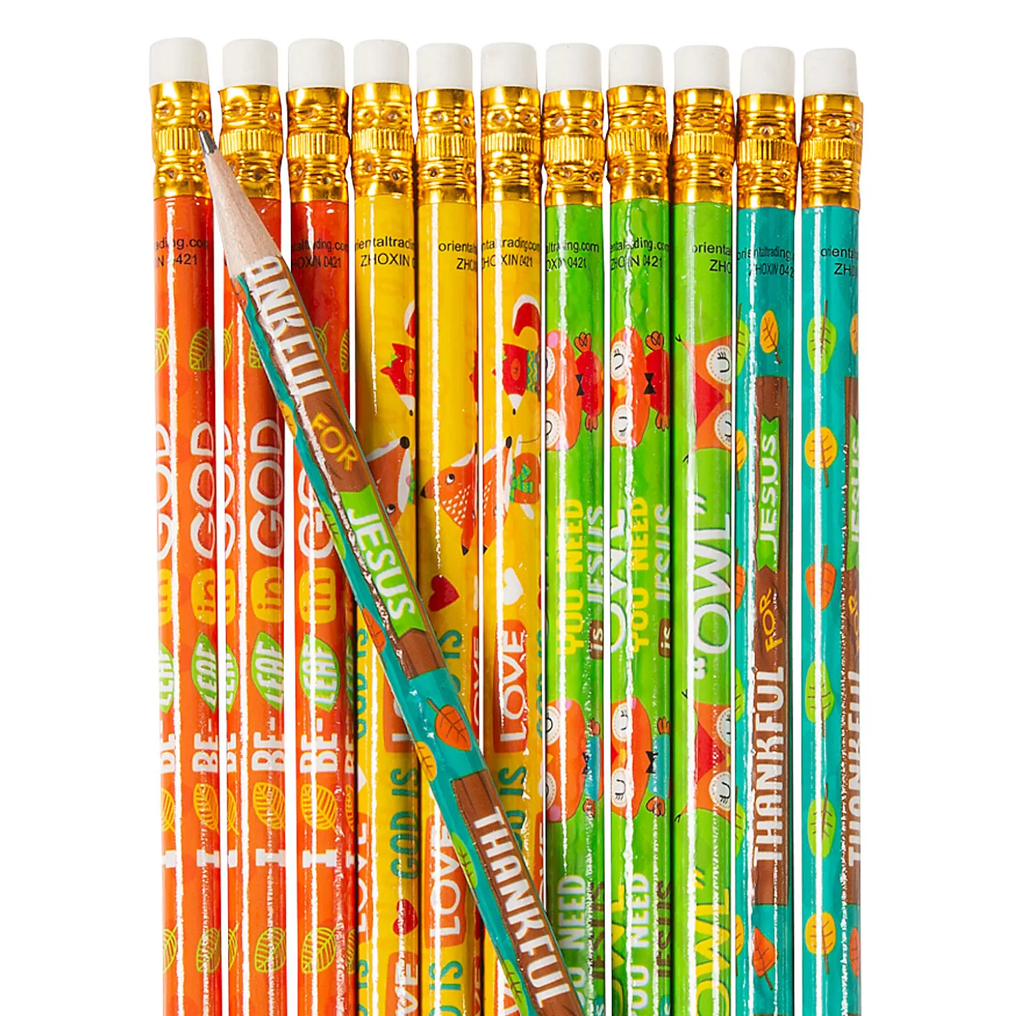 Kids Can Keep Their Faith Close To Hand At Sunday School, Vbs And In Religion Class With Cute Autumn-Themed Pencils, Featuring Leaves And Woodland Creatures, That Read I Be-Leaf In God, Owl You Need Is Jesus, God Is Love, And Thankful For Jesus. Give Them Out As Bible School Giveaways Or Trunk-Or-Treat Prizes That Celebrate Fall Blessings And God’s Love Throughout The Changing Seasons. Wood. 7 1/2″ © Otc