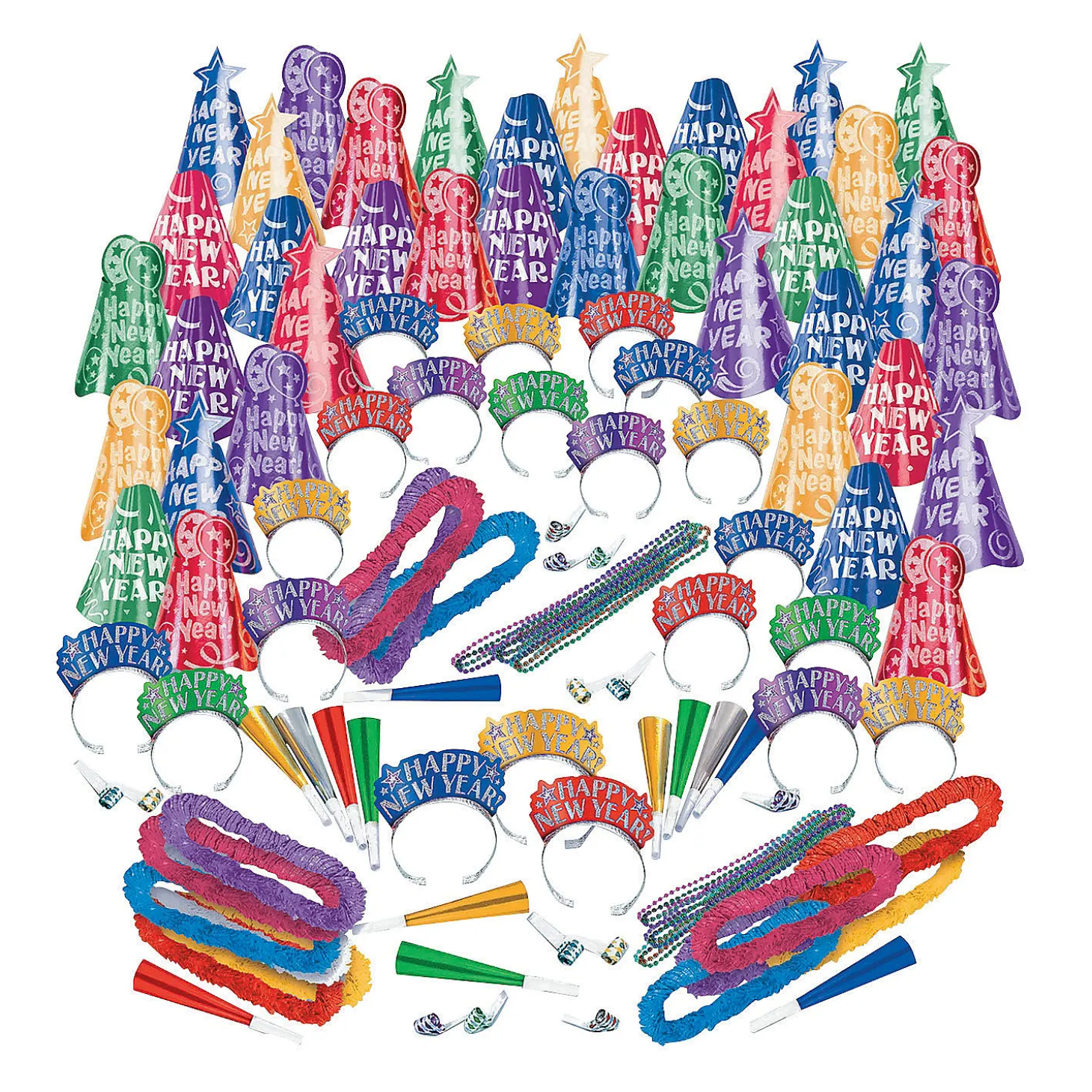 Get All Your New Year’s Party Gear Right Here With This Fantasy Jeweltone New Year’s Eve Party For 100! This New Year’s Eve Party Kit Has Enough Party Supplies To Help Up To 100 Guests Usher In The New Year In An Unforgettable Way. Includes 50 Of Each: 9 1/2″ Paper Cone Hats, 5 1/2″ X 4 1/2″ Paper Glitter Tiaras, 8″ Paper Foil Horns, 3 1/2″ Paper Blowouts, 14″ Diam. Plastic Leis And 13″ Plastic Beaded Necklaces All In Fantasy Jeweltones! One Size Fits Most. (300 Pcs. Per Unit)