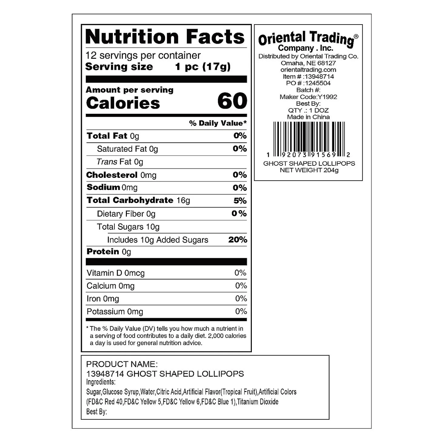 • Goody Bag Fillers: Add A Sweet Surprise To Your Halloween Party Goody Bags By Stuffing Them With Pieces Of Candy Or Other Edible Goodies, Ensuring That Each Guest Leaves With A Delightful Treat To Enjoy Later.• Spooktacular Candy Buffet: Create A Spine-Chilling Candy Buffet With Our Vast Selection Of Sweets, Offering A Variety Of Flavors, Colors, And Textures That Will Leave Your Guests In Awe.• Tasty Options For Trunk-Or-Treat: Find 1000S Of Delectable Candy And Treat Options On Our Website To Fill Up Your Handout Buckets And Delight Kids Of All Ages.Product Description:These Friendly Ghost Lollipops Will Make Boos And Ghouls Of All Ages Float On Air. Hand Them Out As Trick-Or-Treat Giveaways Or Give Them As Halloween Party Favors Or Classroom Prizes. They’Re The Happy Haunters That Kids Of All Ages Will Love To Chomp All Season Long. Individually Wrapped. Fat-Free. © Otc• Candy Is Non-Returnable. For More Information, Visit Our “Return Policy” Page Located On Our Website.• Ingredient, Nutrition, Allergen And Other Product Information Are Provided On Our Web And Mobile Sites For Reference Purpose Only, Without Warranty Or Representation As To Accuracy. Manufacturers Adjust Their Labeling Regularly And Are Solely Responsible For The Accuracy Of The Information. For General Questions Concerning These Items, Please Contact Our Customer Service At 800-228-0475. Size: Each 2 1/4″ Lollipop Is On A 4″ Plastic Stick. Total Wt., 7 Oz.Quantity: 12Tropical Fruit Flavor.
