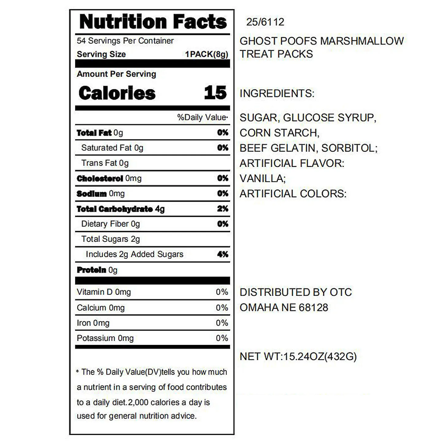 • Spooktacular Candy Buffet: Create A Spine-Chilling Candy Buffet With Our Vast Selection Of Sweets, Offering A Variety Of Flavors, Colors, And Textures That Will Leave Your Guests In Awe.• Creative Candy Crafting: Let Your Creativity Run Wild By Using Our Candies As Unique Craft Supplies, Creating Edible Jewelry, Colorful Mosaics, Or Whimsical Scenes That Will Amaze Your Guests.• Bewitching Cake Toppers: Decorate Your Halloween-Themed Cakes And Cupcakes With Our Candy Selections, Transforming Them Into Edible Masterpieces That Will Impress Both Young And Old Alike.Product Description:Ew! What’s That Smell? This Gaseous Ghost May Seem Gross, But He’s Sure To Give The Giggles To All Your Trick-Or-Treaters. Each Pack Of Ghost Poofs Includes A Handful Of Delicious Vanilla-Flavored Marshmallows. Add These Packs To Your Halloween Candy Selection For Trick Or Treaters Or Give Them Away At Trunk Or Treat! © Otc• Candy Is Non-Returnable. For More Information, Visit Our “Return Policy” Page Located On Our Website.• Ingredient, Nutrition, Allergen And Other Product Information Are Provided On Our Web And Mobile Sites For Reference Purpose Only, Without Warranty Or Representation As To Accuracy. Manufacturers Adjust Their Labeling Regularly And Are Solely Responsible For The Accuracy Of The Information. For General Questions Concerning These Items, Please Contact Our Customer Service At 800-228-0475.Size: Total Weight, 1 Lb.Quantity: (16 Pcs. Per Pkg., 54 Pkgs. Per Unit) Fat-Free.Vanilla Flavor.