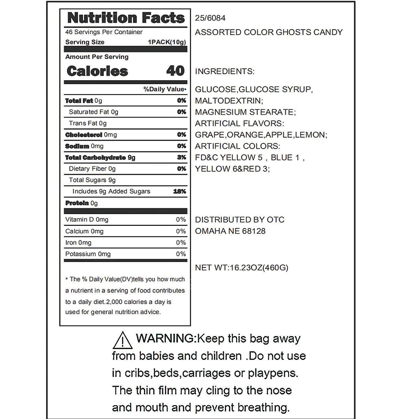 • Spooktacular Candy Buffet: Create A Spine-Chilling Candy Buffet With Our Vast Selection Of Sweets, Offering A Variety Of Flavors, Colors, And Textures That Will Leave Your Guests In Awe.• Goody Bag Fillers: Add A Sweet Surprise To Your Halloween Party Goody Bags By Stuffing Them With Pieces Of Candy Or Other Edible Goodies, Ensuring That Each Guest Leaves With A Delightful Treat To Enjoy Later.• Creative Candy Crafting: Let Your Creativity Run Wild By Using Our Candies As Unique Craft Supplies, Creating Edible Jewelry, Colorful Mosaics, Or Whimsical Scenes That Will Amaze Your Guests.Product Description:These Spooky Specters Will Make A Tasty Treat. Pass Out These Halloween Candy Ghosts To Your Trick Or Treaters Or Serve Them As Halloween Party Treats. Fat-Free. © Otc• Candy Is Non-Returnable. For More Information, Visit Our “Return Policy” Page Located On Our Website. • Ingredient, Nutrition, Allergen And Other Product Information Are Provided On Our Web And Mobile Sites For Reference Purpose Only, Without Warranty Or Representation As To Accuracy. Manufacturers Adjust Their Labeling Regularly And Are Solely Responsible For The Accuracy Of The Information. For General Questions Concerning These Items, Please Contact Our Customer Service At 800-228-0475.Size: Total Wt., 1 Lb.Quantity: Approx. 16 Pcs. Per Pkg., 46 Pkgs. Per Unitgrape, Orange, Apple And Lemon Flavors.