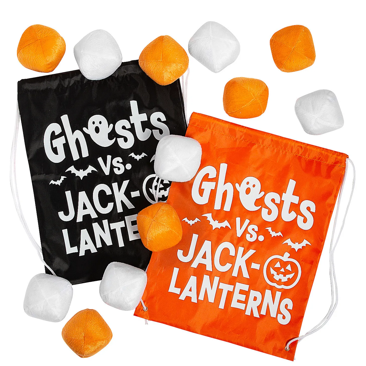 Who Will Win, Ghosts Or Jack-O’-Lanterns? Split Into Two Teams, Load Each Team Member Up With Plush Balls And Let The Battle Commence! This Game Makes A Fun Halloween Party Activity Or Fall Birthday Party Game. Or Break It Out During P.E. Class As A Seasonal Way To Keep Kids Active! Polyester. (26 Pcs. Per Unit) 24 Plush Balls, 4″ Diam. And 2 Drawstring Bags, 14″ X 18″. © Otc