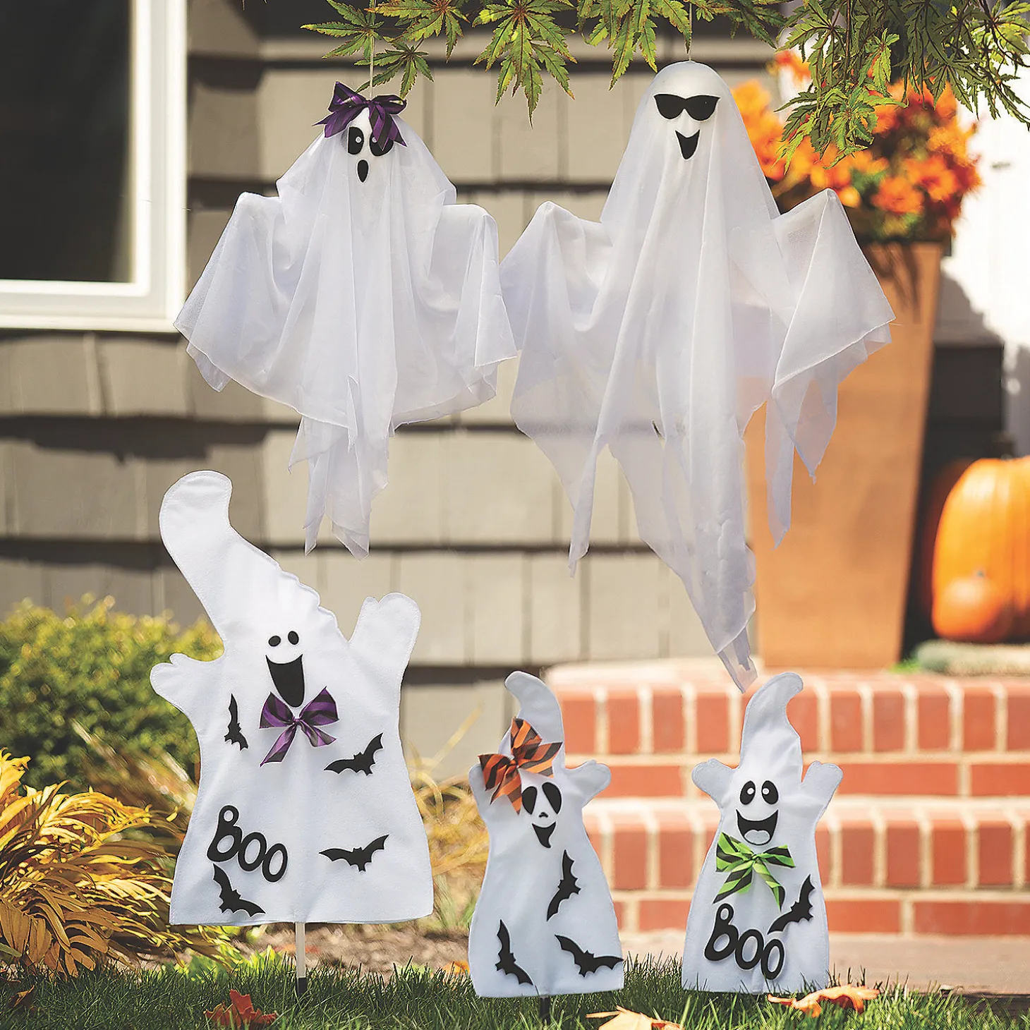 Looking For Friendly Halloween Decorations For Your Yard? This Cute Ghost Family Is Perfect For Lining Your Sidewalk, Drive, Or In Front Of Your Patio To Help Greet Trick-Or-Treaters Or Visitors Throughout The Halloween Season! Polyester With Plastic Stakes. (5 Pcs. Per Set) 7″ – 21″