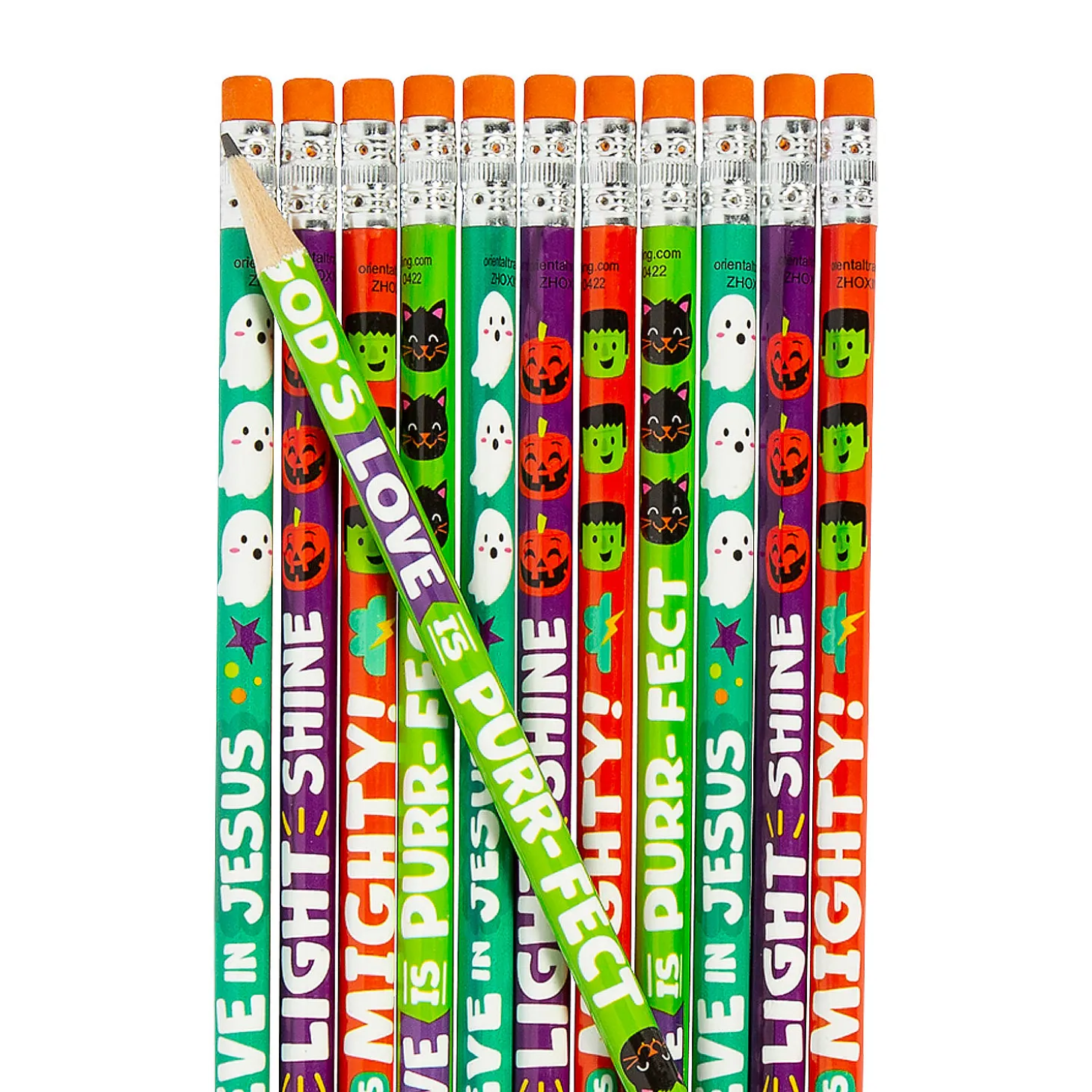 Encourage Kids To Craft Spooky Stories This October With These Halloween Icons Religious Pencils. Crafted In A Fun Array Of Colors And Featuring Iconic Spooky Season Graphics, These Pencils, With Phrases Like “Boo-Lieve In Jesus” And “God’s Love Is Purr-Fect” Will Remind Them Of God’s Power As They Use Them To Create Their Stories. Wood. (2 Dozen Per Unit) 7 1/2″ © Otc