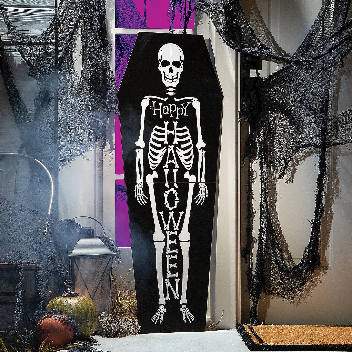 Greet Trick-Or-Treaters And Anyone Else Who Drops By To Rest Their Bones On Your Porch With An Outdoor Halloween Decoration Who’s A Real Stand-Up Guy. Prop This Wooden Skeleton Against A Wall Or Hang Him By Your Front Door To Wish All The Souls In Your Neighborhood A Happy Halloween. Wood. 16 1/2″ X 44″ Includes Hardware For Hanging. © Otc