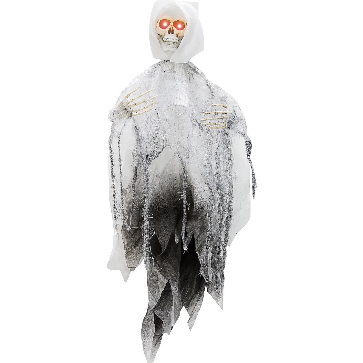Hanging Shaking Reaperwhite Gauzy Reaper Hangs From Any Corner In Your Haunted Scene! The Eyes Light Up Red, And It Also Shakes In Fear, As Will All Your Guests! Drapey Gauze Drifts Spookily With Every Breeze! Arms Are Poseable. Sound Activated And Has A Tryme Button! 36″ Tall. Requires 2 Aa Batteries, Not Included.