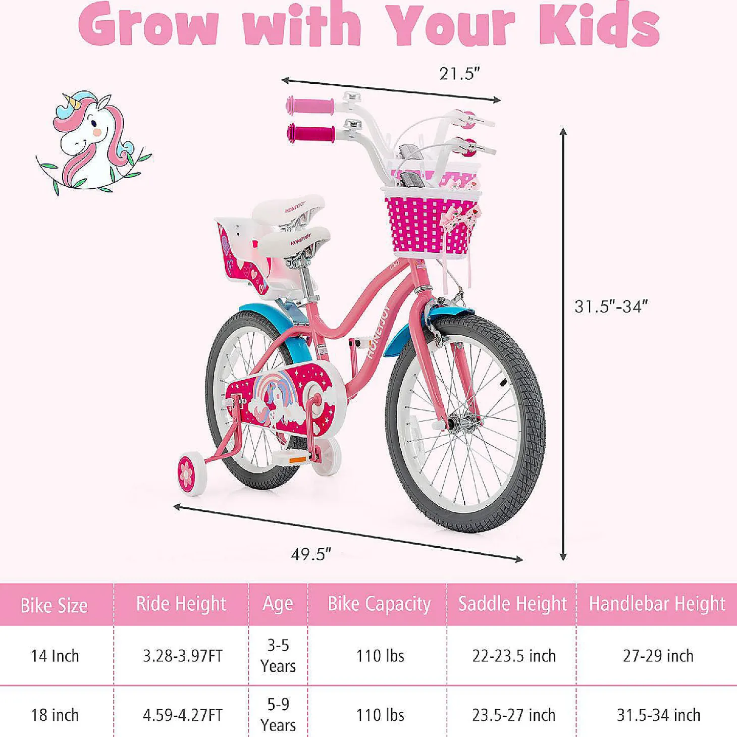 Honeyjoy 18″ Kids Bicycle W/Training Wheels & Basket 5-9Yrs Pink
