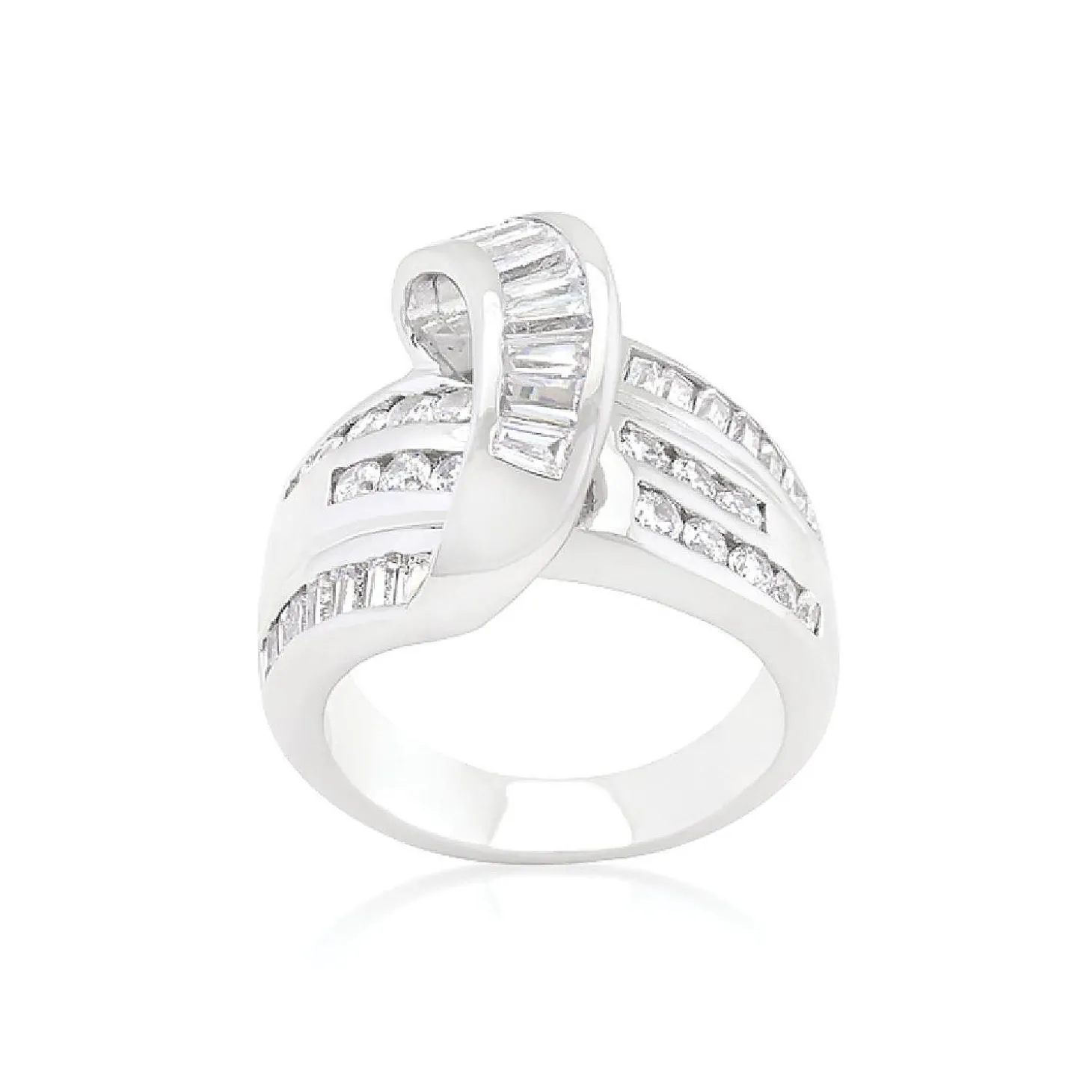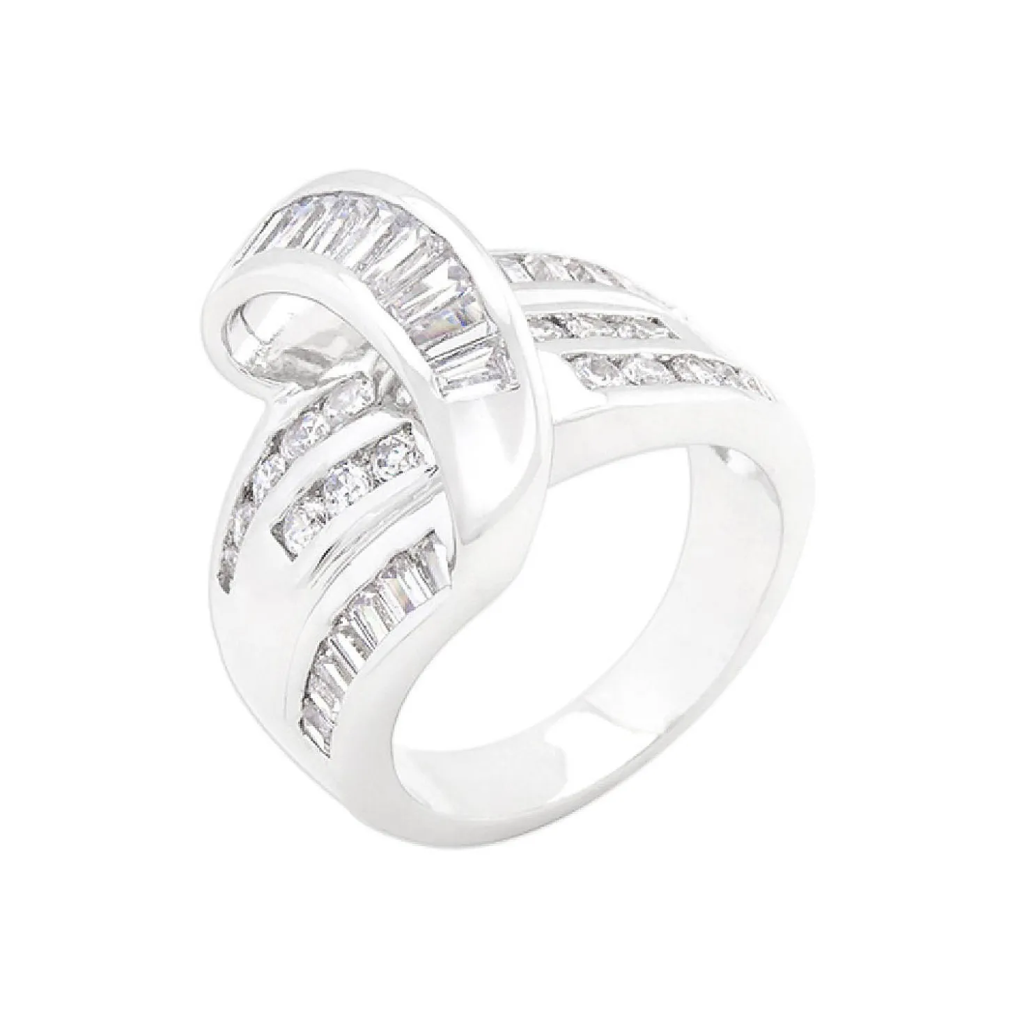 Genuine Rhodium Plated Channel Set Overlapping Fashion Ring With Round Cut And Emerald Cut Stones Polished Into A Lustrous Silvertone Finish. Channel Set Cubic Zirconia Stones In A Diagonal Design Mingle Together To Create This Classic Overlapping Cocktail Piece. Our Genuine Rhodium Finish Is Achieved Using An Electroplating Process That Coats The Item With Heavy Layers Of Rhodium A Close Cousin Of Platinum That Costs Three Times As Much Which Gives Our Jewelry A Platinum Luster.Plating Color: Silvertone Finish. Materials: Cubic Zirconia.Base Material: Lead Free Alloy (Brass). Carat Weight: 2.4 (Ct).Stone Cut: Round, Emerald. Ring Band Width: 4.3 (Mm)Size: 18.5 (Mm) X 22 (Mm) X 8.6 (Mm), Color: Clear.Stone Size: 1.4 Mmx 1.4 Mm, 2.8 Mmx 2.3 Mm