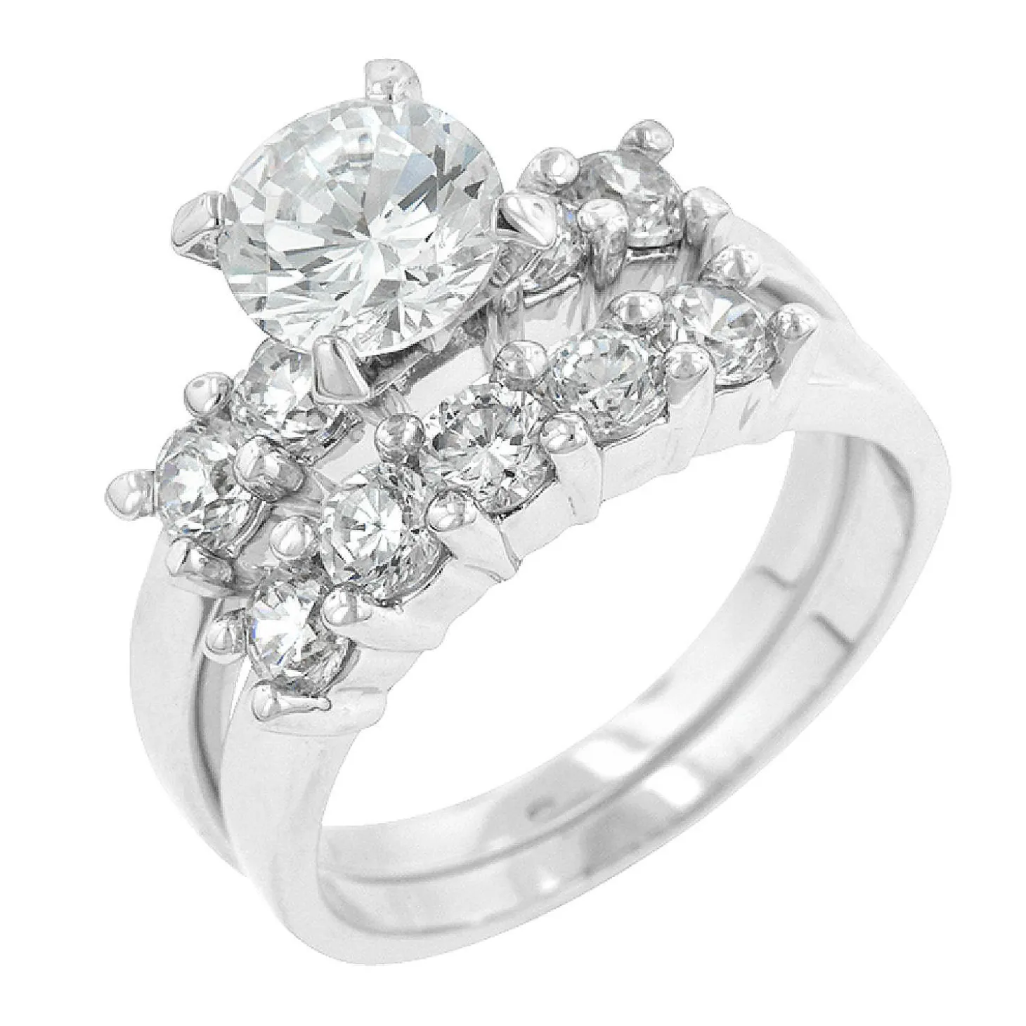 Genuine Rhodium Plated Classical Wedding Set With Clear Cubic Zirconia Polished Into A Lustrous Silvertone Finish. Our Classic Wedding Set Has Stood The Test Of Time. This Ever Popular Style Will Remain A Staple Of Our Wedding Line. Our Genuine Rhodium Finish Is Achieved Using An Electroplating Process That Coats The Item With Heavy Layers Of Rhodium A Close Cousin Of Platinum That Costs Three Times As Much Which Gives Our Jewelry A Platinum Luster.Basemetal: Lead Free Alloy (Brass). Style: Wedding, Engagement.Materials: Cubic Zirconia. Setting Type: Prongs.Plating Color: Silvertone Finish.Audience: Women. Stone Cut: Round.Country Of Origin: China.