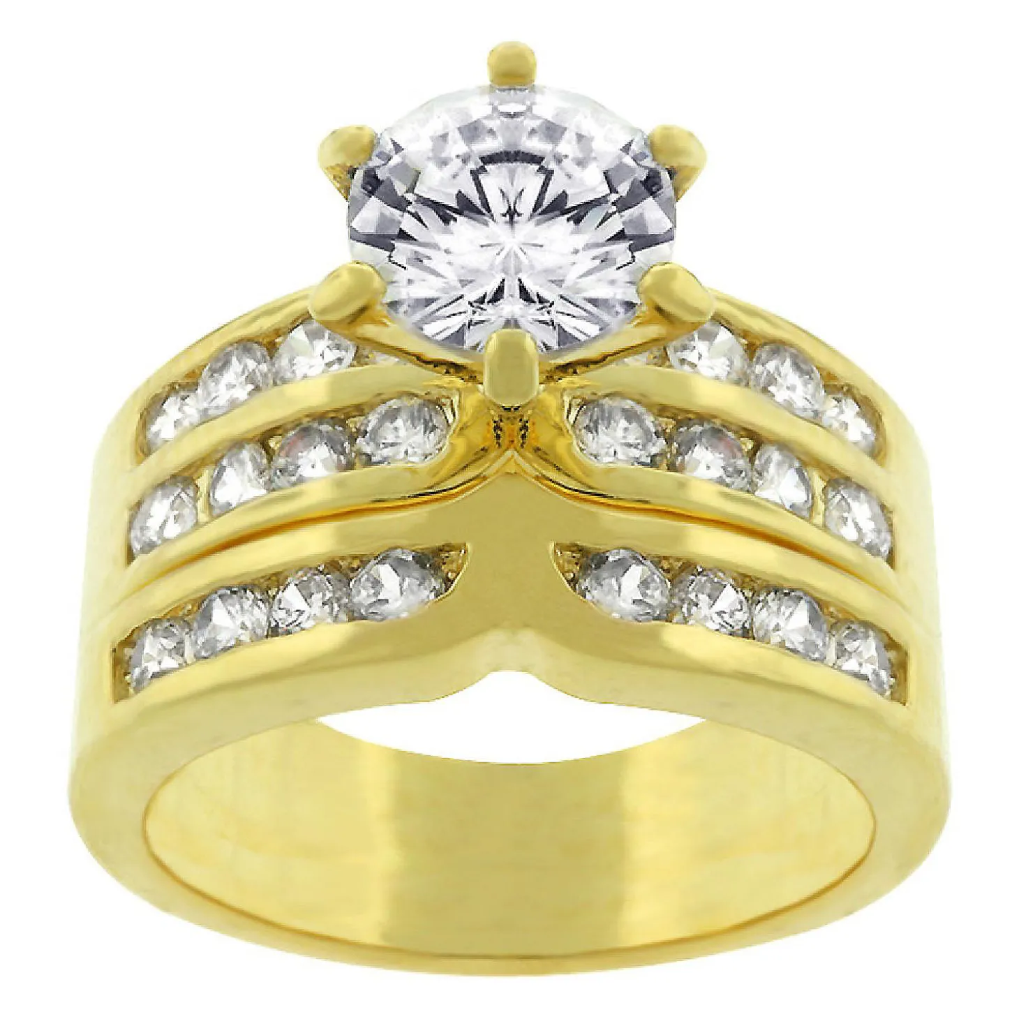 18K Gold Plated Engagement Ring Set With Channel And Prong Set Round Cut Clear Cubic Zirconia Polished Into A Lustrous Goldtone Finish. This Ring Is An Absolute Classic And It Looks Absolutely Fabulous. The Center Stone Is 1.35 Carat Simulated Size Set On Rhodium Prongs. The Side Shoulders Boast Another .95 Carats Worth Of Stones To Make A 2.3 Total Carat Weight Cubic Zirconia Ring. We Also Have A Silver Tone Version Available. 18K Plated Gold Is Achieved Using An Electroplating Process That Coats The Item With Heavy Layers Of 18K Yellow Gold And Color-Treated To Display A Perfect 14K Hamilton Gold Color.Basemetal: Lead Free Alloy (Brass). Style: Engagement.Materials: Cubic Zirconia. Setting Type: Channel, Prongs.Plating Color: Goldtone Finish.Audience: Women. Stone Cut: Round.Country Of Origin: China.