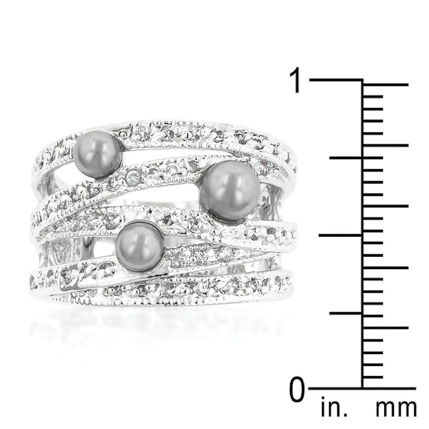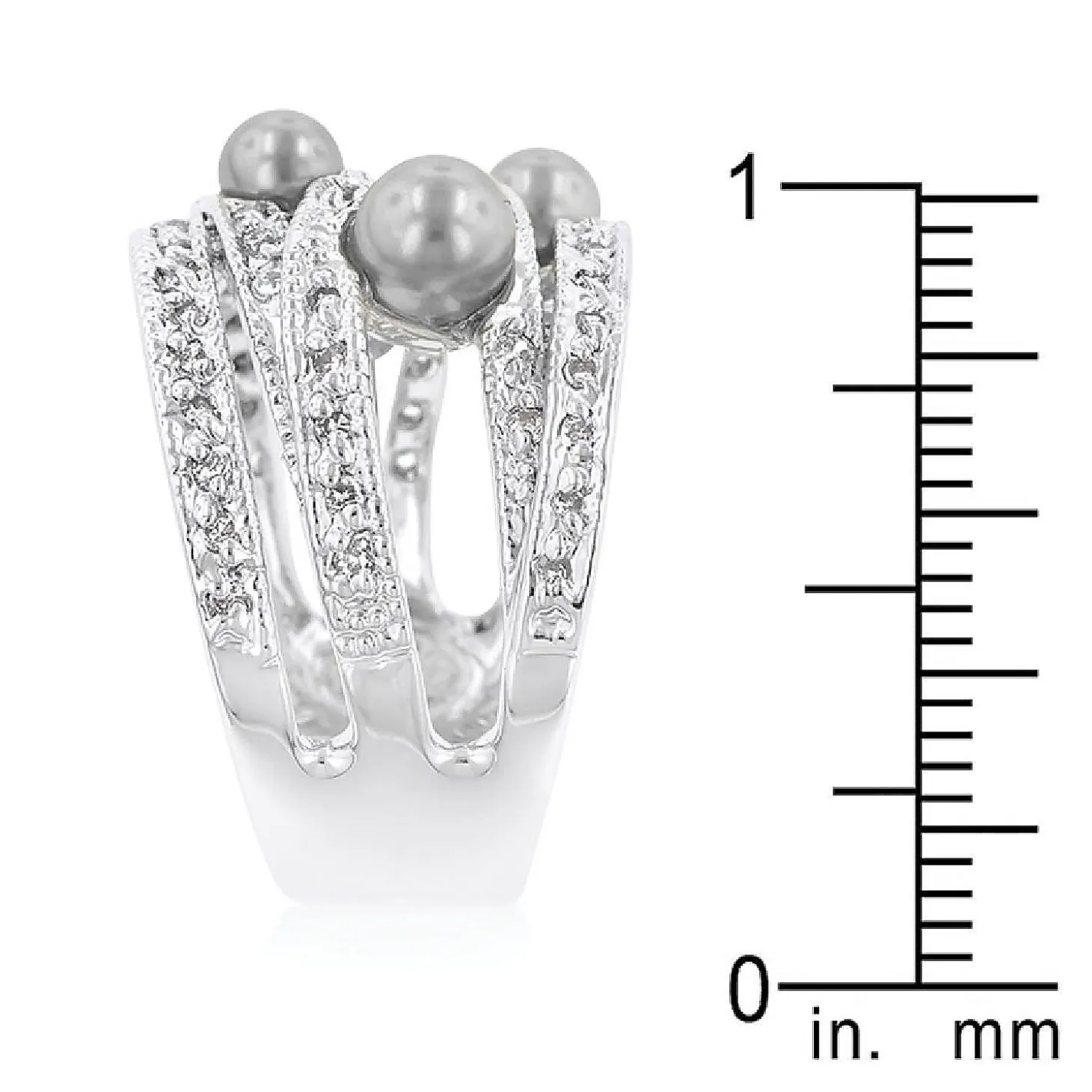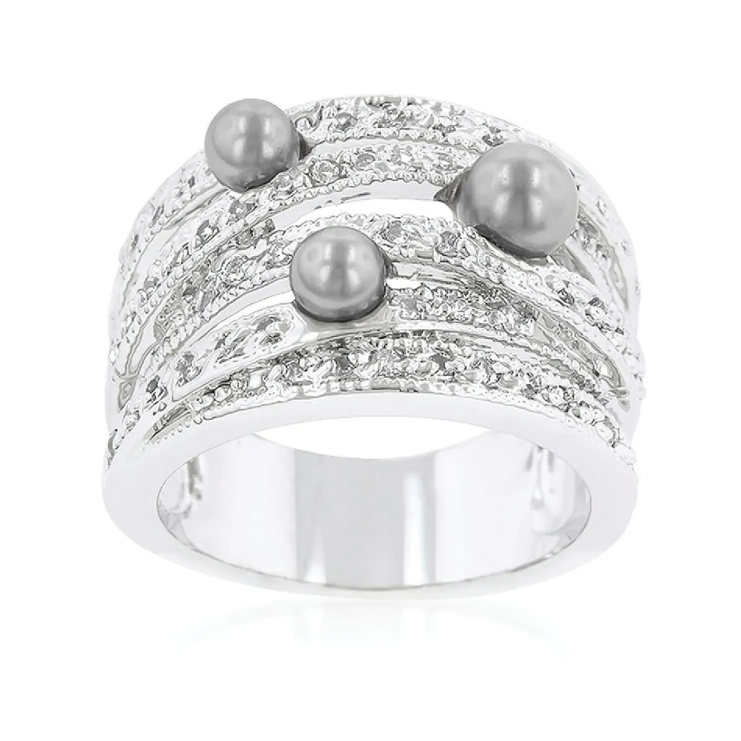 Genuine Rhodium Plated Gray Pearl Cocktail Ring Polished Into A Lustrous Silvertone Finish. Perfect For Day Or Night This Ring’s Luminous Faux Pearls Lined Up Fabulously In An Intricate Silver Tone Setting. Our Genuine Rhodium Finish Is Achieved Using An Electroplating Process That Coats The Item With Heavy Layers Of Rhodium A Close Cousin Of Platinum That Costs Three Times As Much Which Gives Our Jewelry A Platinum Luster.Plating Color: Silvertone Finish. Materials: Simulated Pearl, Cubic Zirconia.Base Material: Lead Free Alloy (Brass). Carat Weight: .44 (Ct).Stone Cut: Round. Ring Band Width: 7.4 (Mm)Size: 22 Mm L X 15 Mm W X 7 Mm H, Color: Gray, Clear.Stone Size: 1 Mm