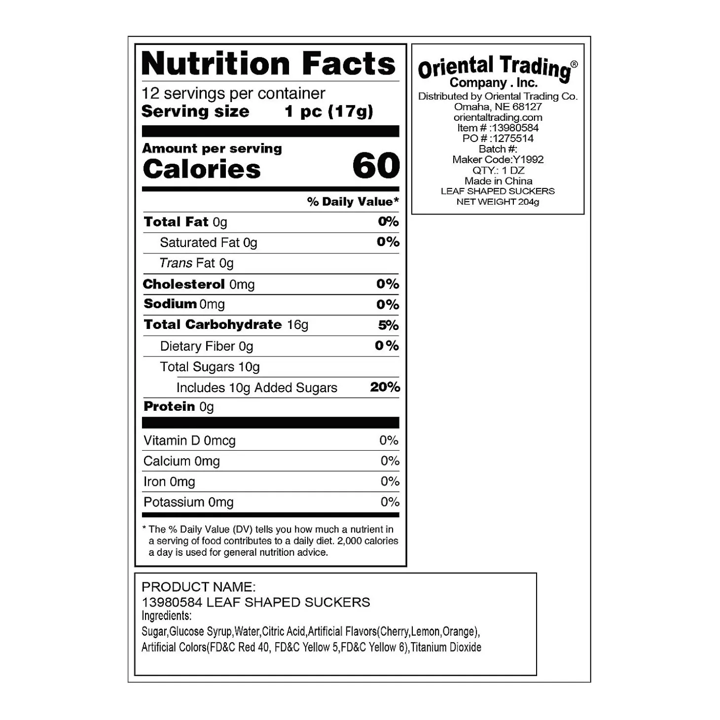 Celebrate The Sweetness Of Fall With These Cute Leaf-Shaped Lollipops. Each Lollipop Looks Like An Autumn Leaf And Is Perfect As A Harvest Festival Prize Or Handout. Featuring Fruit Flavors Or Cherry, Lemon Or Orange, These Leaf-Shaped Lollipops Are An Autumn Treat! Easy To Hand Out, These Individually-Packaged Lollipops Make Great Party Favors Or Giveaways. Individually Wrapped. Each 2″ Candy Is On A 4″ Plastic Stick. Assorted Fruit Flavors. Total Wt. 7 Oz. © Otc• Candy Is Non-Returnable. For More Information, Visit Our “Return Policy” Page Located On Our Website.• Ingredient, Nutrition, Allergen And Other Product Information Are Provided On Our Web And Mobile Sites For Reference Purpose Only, Without Warranty Or Representation As To Accuracy. Manufacturers Adjust Their Labeling Regularly And Are Solely Responsible For The Accuracy Of The Information. For General Questions Concerning These Items, Please Contact Our Customer Service At 800-228-0475.
