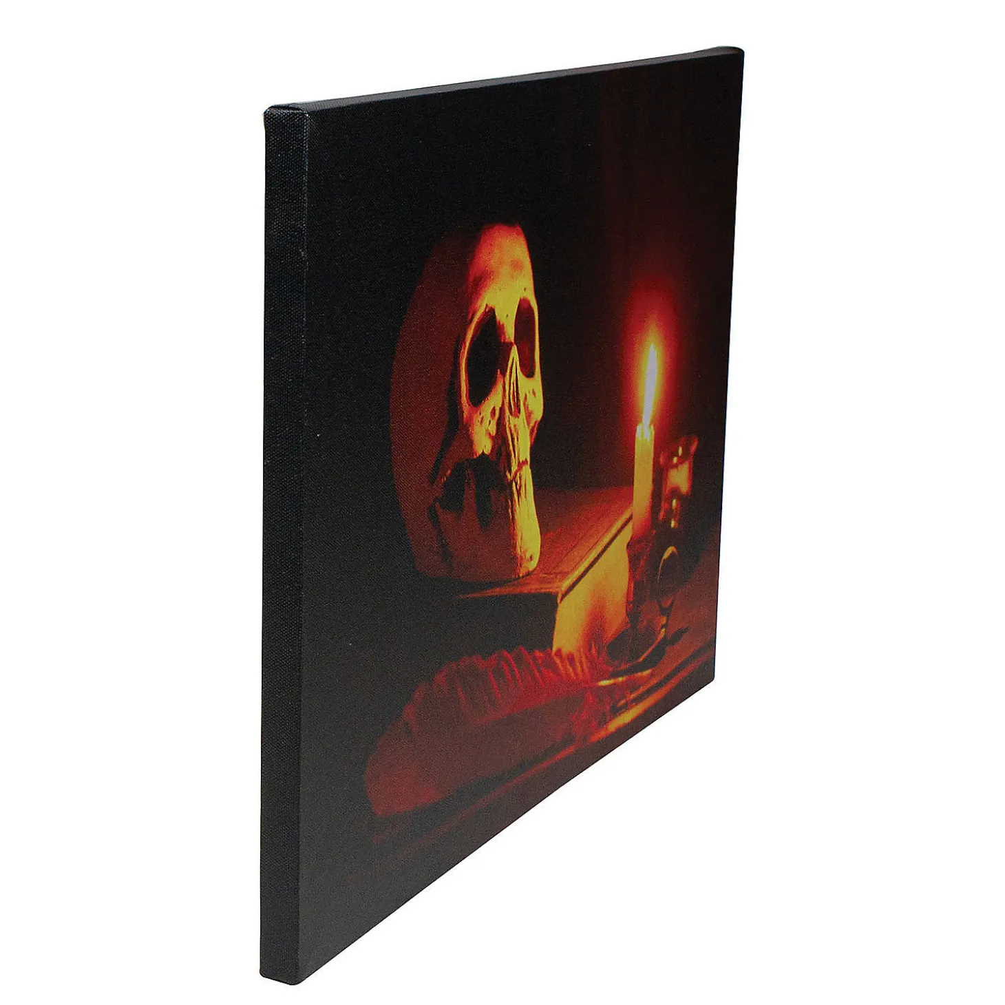 Add An Artistic Twist To Your Halloween Night! This Spooky Wall Art Will Leave Your Friends In Shock. The Antique Candle Lighting Up A Skull Holder Will Be An Epic Display That Will Blow Their Minds Off! It Incites A Lot Of Thrill And Mystery. Product Features: Skull Set Upon A Book Being Illuminated By A Single Candle Set In An Antique Candle Holder Illuminated By A Single Flickering Amber Led Light Located On The Candlewick Comes Ready-To-Hang With A Hook On The Back Convenient On/Off Switch On The Side Recommended For Indoor Use Only Dimensions: 12″H X 15.75″W X 0.5″D Material(S): Canvas/Plastic/Mdf Note: Requires (2) Aa Batteries – Not Included