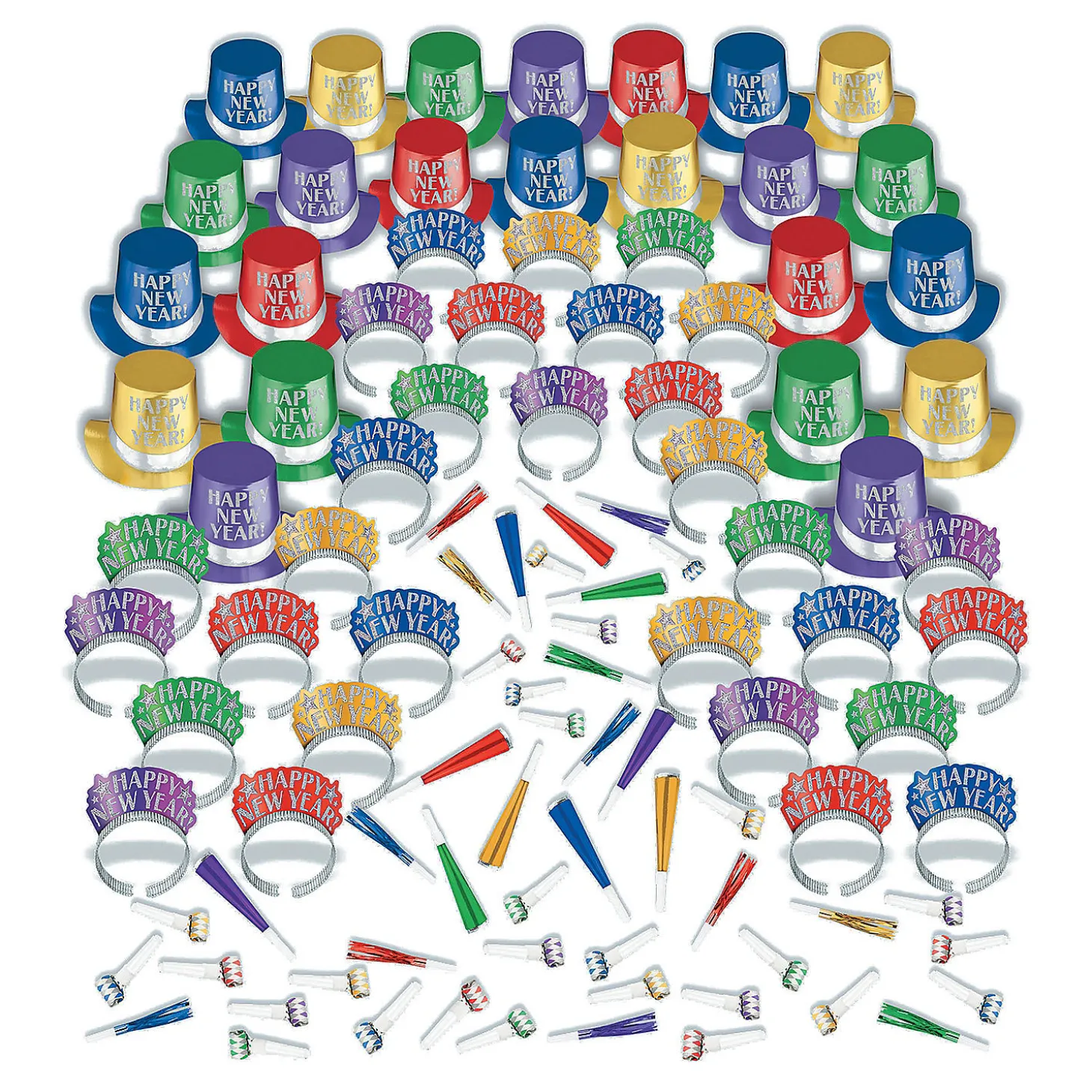 Opulent Affair Jeweltone New Year’s Eve Party For 100. Get All Your New Year’s Party Gear Right Here! Don’T Waste Time Running Around Town Gathering Accessories And Favors For All Your Guests To Enjoy. This New Year’s Eve Party Kit Has Enough Party Supplies To Help Up To 100 Guests Usher In The New Year In An Unforgettable Way. Includes 50 Glitter Hats, 50 Glitter Foil Tiaras, 25 Foil-Fringed Squawkers, 25 Foil Horns And 50 Paper Blowouts. 9 1/2″ Paper Top Hats, 5 1/2″ X 4 1/2″ Paper Glitter Tiaras, 8″ Paper Foil Horns, 3 1/2″ Paper Blowouts. One Size Fits Most. (200 Pcs. Per Unit)