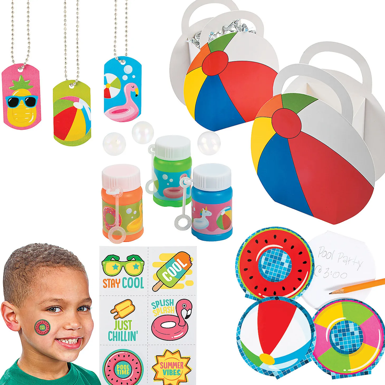Make A Big Splash With This Exciting Assortment Of Pool Party Favors! Whether You Are Hanging Out Poolside Or Just Having A Pool Themed Party, This Convenient Favor Kit Makes It Easy To Allow Your Guests To Take The Awesome Pool Party Fun Home With Them. (144 Pcs. Per Unit)Includes:• 12 Cardboard Beach Ball Treat Boxes (3″ X 3″ X 4 3/4″ Box With 6″ Beach Ball Cutouts And 1 1/2″ Handles. Simple Assembly Required.)• 24 Plastic Pool Party Mini Bubble Bottles (Each 2″ Plastic Bottle Includes 1 Oz. Of Bubbles And Attached Wand. Assorted.)• 12 Metal Pool Party Dog Tag Necklaces (2″ Dog Tag On A 24″ Ball Chain.)• 24 Paper Pool Party Notepads (4″ X 4″ 30 Blank Pgs.)• 72 Summer Fun Temporary Tattoos (1 1/2″ Easy To Apply And Remove. Safe And Non-Toxic.)• Assortments Are Subject To Change At Any Time And May Vary From Picture Shown. Substituted Items Will Be Similar In Nature.