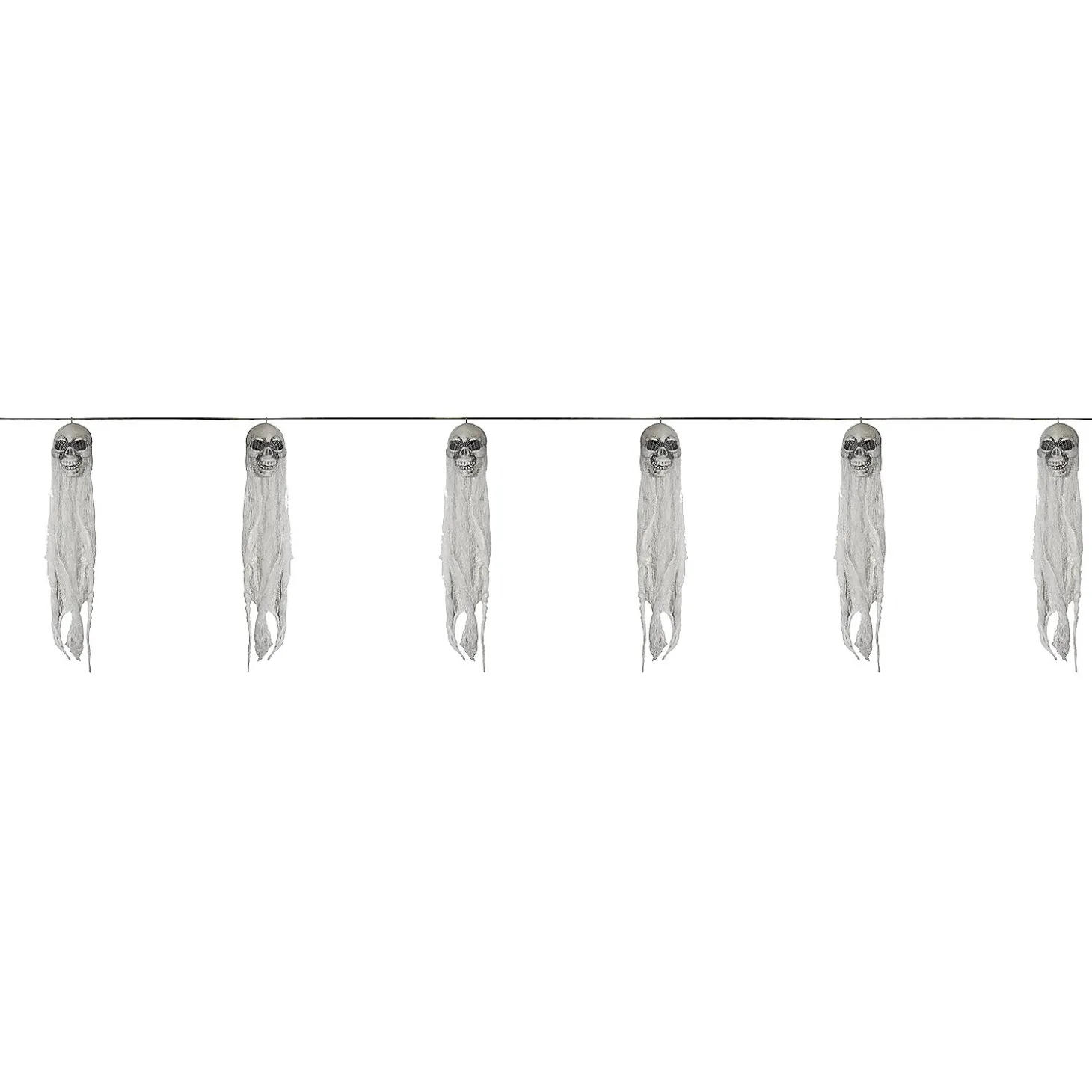 Skull And Ghost Garland 60 In.Great Way To Decorate For Your Halloween Party! Plastic Skulls Draped With Cheesecloth Styling, Attached To A 60″ Long Cord. Each Skull Head With Draping Measures 18″ Tall.