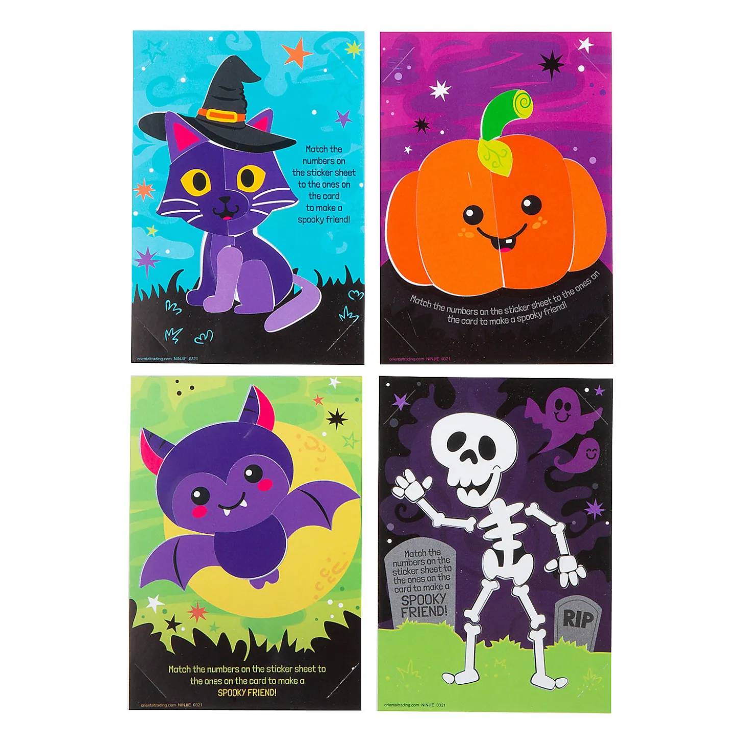 Create A Squad Of Spooky Friends With These Colorful Halloween Sticker By Numbers Cards. The Cards Include Everything You Need To Design An Assortment Of Halloween Sticker Pictures, Including A Cat With A Witch’s Hat, A Scary Skeleton, A Friendly Jack-O’-Lantern, And A Vampire Bat. Simply Match The Numbers On The Sticker Sheet To The Numbers On The Card And Watch Your Halloween Designs Come To Life! Paper. (2 Dozen Per Unit) 4″ X 5-3/4″ © Otc