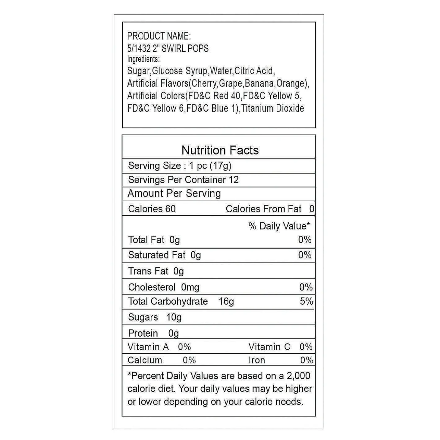 • What’s Included: This Large Assortment Includes 110 Individually Wrapped, Swirled Rainbow Colored Lollipops In Assorted Shapes And Fruit Flavors. Assortment May Vary. • Non-Returnable: Candy Is Non-Returnable. For More Information, Visit The Return Policy Page Located On Our Website.• Important Country Of Origin Information: For Certain Items Sold By Otc On Our Web Or Mobile Sites, Country Of Origin Information Can Change And What Is Displayed May Not Be Accurate Or Consistent With Manufacturer Information. For Up To Date Country Of Origin Information, It Is Recommended That You Rely On Product Packaging Or Other Manufacturer Information.• Product Information: These Swirled Lollipops Are Fat-Free. Details About Ingredients, Nutrition, Allergens And Other Product Information Are Provided On Our Web And Mobile Sites For Reference Purpose Only, Without Warranty Or Representation As To Accuracy. Manufacturers Adjust Their Labeling Regularly And Are Solely Responsible For The Accuracy Of The Information. For General Questions Concerning These Items, Please Contact Our Customer Service At 800-228-0475.Product Description: Create A Candy Buffet With Colorful Vintage Charm! This Swirl Lollipop Assortment Includes 110 Individually Wrapped Suckers That Are As Delicious As They Are Decorative. Style The Assortment Of Different Shaped Lollipops In Glass Jars Of Various Size And Fill With Other Candies To Round Out Your Buffet Or Party Tables. Assorted Fruit Flavors Make These Suckers Timeless Favorites. Fun For Wedding Receptions, Birthday Parties, Holiday Gatherings And Corporate Events. Specs:Quantity: 44 Oz., 110 Lollipopsdietary Needs: Fat-Free