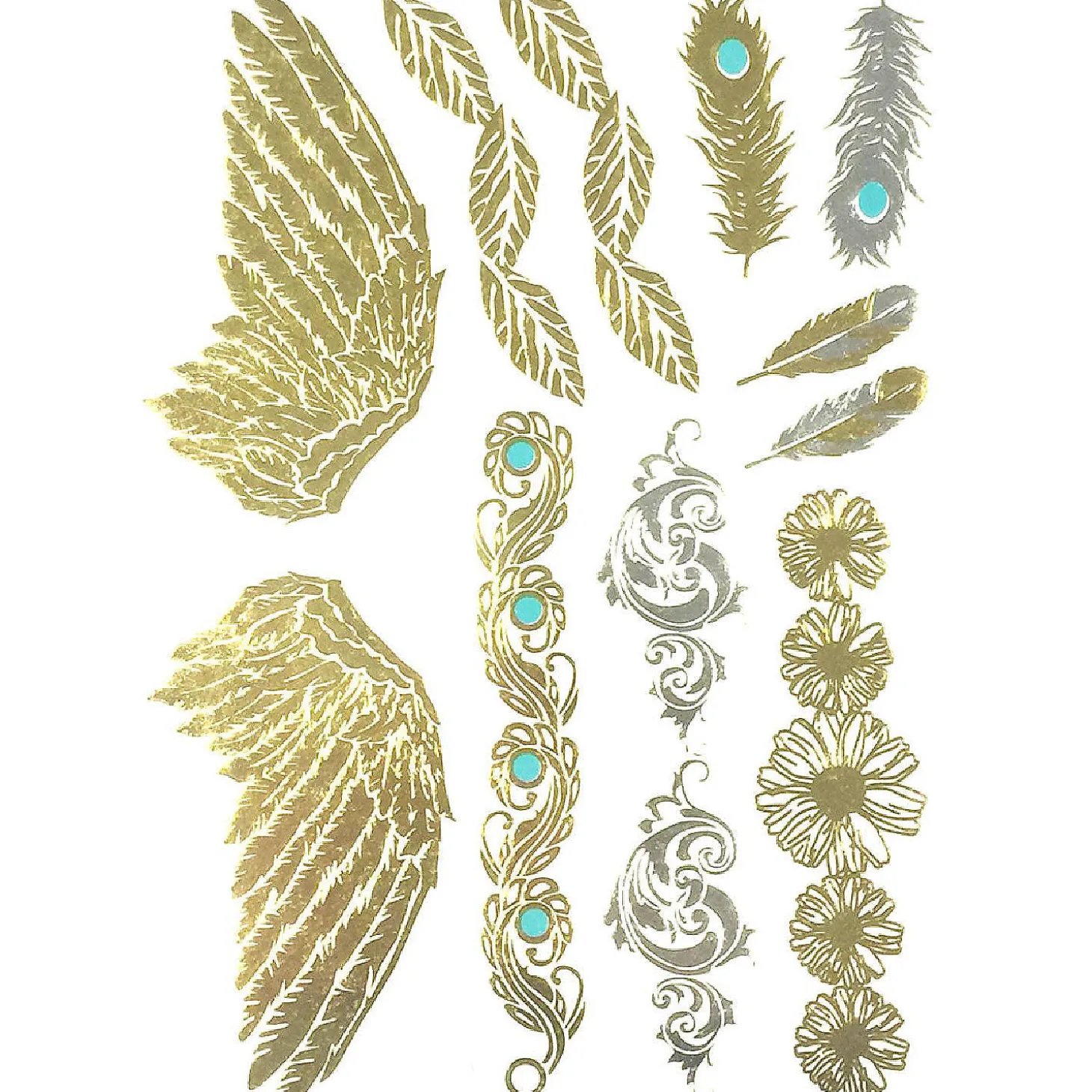 Wrapables Large Metallic Gold Silver And Black Body Art Temporary Tattoos, Feathers, Wings, Daisies_1